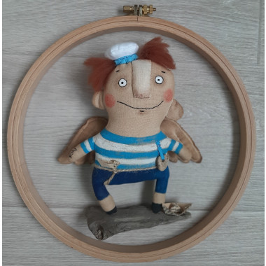 Игрушка выполнена из грунтованного текстиля, волосы - пряжа. Украшена росписью акриловыми красками, вышивкой, аппликацией из крымского камня-куриного бога и бумажным корабликом.